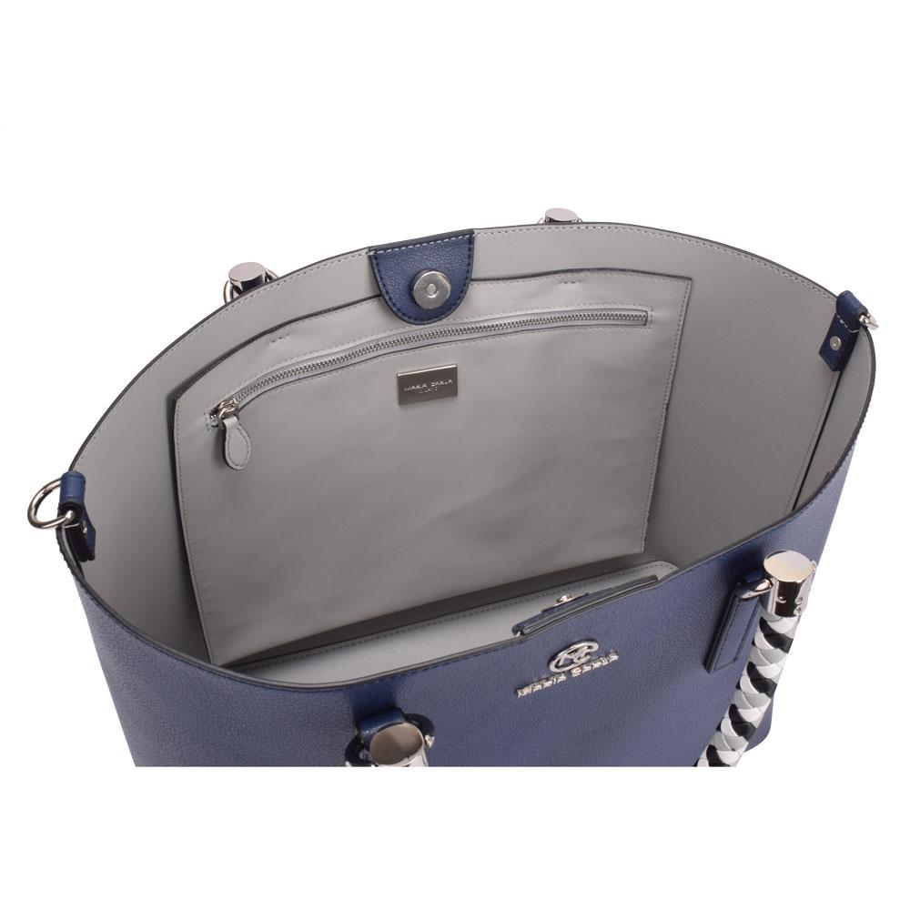 Smooth leather with woven leather handles. Includes adjustable cross body/ shoulder straps. Main compartment with magnetic closure. Silver metal detailing.